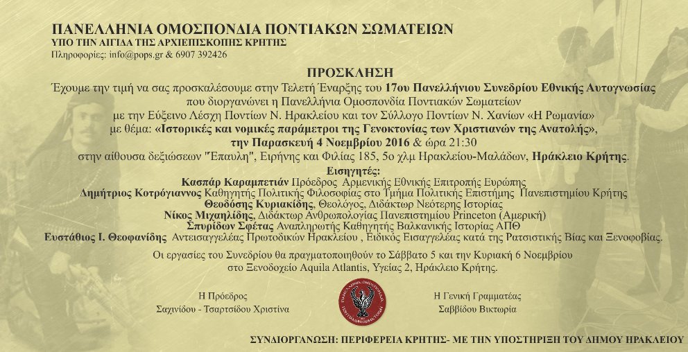 Φέτος, μετά από απόφαση του Διοικητικού Συμβουλίου της «Εύξεινου Λέσχη» Ποντίων Ηρακλείου Κρήτης και του Συλλόγου Ποντίων Χανίων «Η Ρωμανία», το 17ο Πανελλήνιο Συνέδριο Ποντιακών Συλλόγων για την Εθνική Αυτογνωσία, θα πραγματοποιηθεί στο Ηράκλειο Κρήτης στις 4, 5 και 6 Νοεμβρίου 2016, με θέμα: «Ιστορικές και νομικές παράμετροι της Γενοκτονίας των Χριστιανών της Ανατολής».