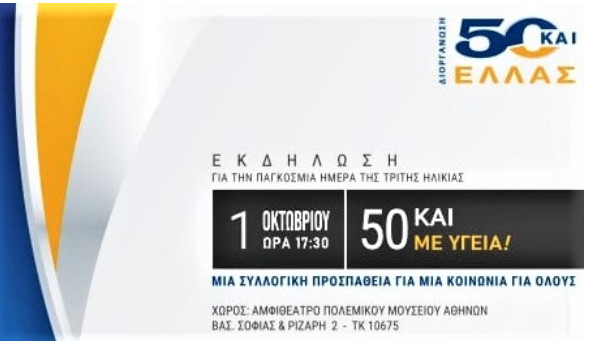 Στην Ελλάδα λειτουργεί ο Σύλλογος «50+» και μάλιστα οργανώνει εκδήλωση στο Πολεμικό Μουσείο Αθηνών, στις 17.30, την Παρασκευή, 1 Οκτ 2021. Ο όρος ηλικιωμένος συνήθως αφορά ανθρώπους άνω των 65 ετών ενώ κατά άλλους άνω των 70 ετών. Σήμερα τα άτομα άνω των 65 ετών αντιπροσωπεύουν πάνω από 1/3 των ασθενών της πρωτοβάθμιας περίθαλψης.