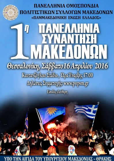 Η «Πανελλήνια Ομοσπονδία Πολιτιστικών Συλλόγων Μακεδόνων», συμπληρώνοντας δύο χρόνια λειτουργίας, διοργανώνει το Σάββατο 16 Απριλίου 2016 και ώρα 5μμ στο «Καυτανζόγλειο» στάδιο Θεσσαλονίκης, την «1η ΠΑΝΕΛΛΗΝΙΑ ΣΥΝΑΝΤΗΣΗ ΜΑΚΕΔΟΝΩΝ».