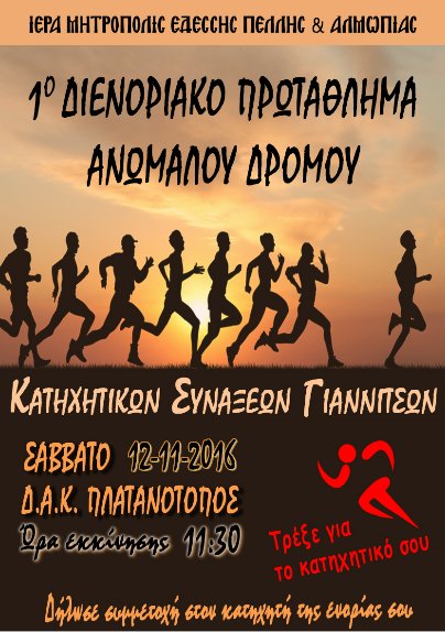 Η ενορία Αγίων Αποστόλων Πέτρου και Παύλου Γιαννιτσών με την ευλογία της Ιεράς Μητροπόλεως προκηρύσσει και διοργανώνει αγώνες ανωμάλου δρόμου με την επωνυμία «1Ο ΔΙΕΝΟΡΙΑΚΟ ΠΡΩΤΑΘΛΗΜΑ ΑΝΩΜΑΛΟΥ ΔΡΟΜΟΥ» και προσκαλεί όλα τα παιδιά των Κατηχητικών Ενοριακών Συνάξεων της πόλεως των Γιαννιτσών να συμμετέχουν στους αγώνες. Επίσης παρακαλεί όλους τους κατηχητές/τριες να συμβάλλουν στην καλή οργάνωση του 1ου Διενοριακού Πρωταθλήματος Ανωμάλου δρόμου.