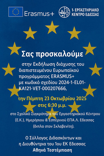 1ο ΕΡΓΑΣΤΗΡΙΑΚΟ ΚΕΝΤΡΟ ΈΔΕΣΣΑΣ: ΕΚΔΗΛΩΣΗ ΔΙΑΧΥΣΗΣ ΤΟΥ ΠΡΟΓΡΑΜΜΑΤΟΣ ERASMUS Πέμπτη, 16 Οκτωβρίου, 2025 - 16:13 Κατηγορία: Εκδηλώσεις