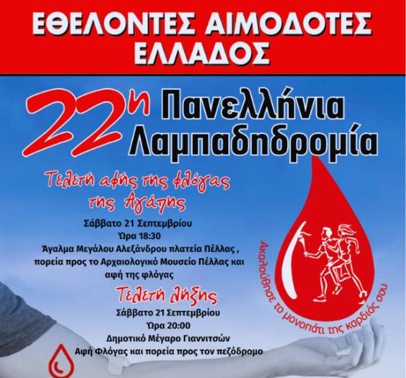 Στην 22η Πανελλήνια Λαμπαδηδρομία Εθελοντών Αιμοδοτών, που θα πραγματοποιηθεί στις 21 Σεπτεμβρίου 2024, συμμετέχει για πρώτη φορά ο Δήμος Πέλλας!
