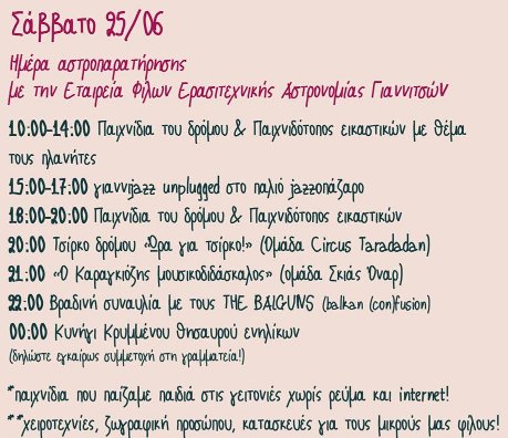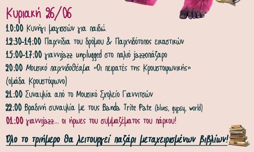 Τρεις μέρες γεμάτες ήχους, παιχνίδια και μουσικές. Αναβίωση παιχνιδιών που παίζαμε ως παιδιά, κυνήγι μαγισσών, παιχνίδι χαμένου θησαυρού για μεγάλους, παιδότοπος εικαστικών, κουκλοθέατρο, καραγκιόζης, τσίρκο δρόμου, παραστάσεις, παζάρι μεταχειρισμένων βιβλίων, αστροπαρατήρηση, είναι μια μικρή ιδέα του τι θα συμβεί στο πάρκο του Αη Γιώργη! Και μετά την Δύση του ήλιου, live με τους Kazoo, The BalGuns, Banda Trite Pate!