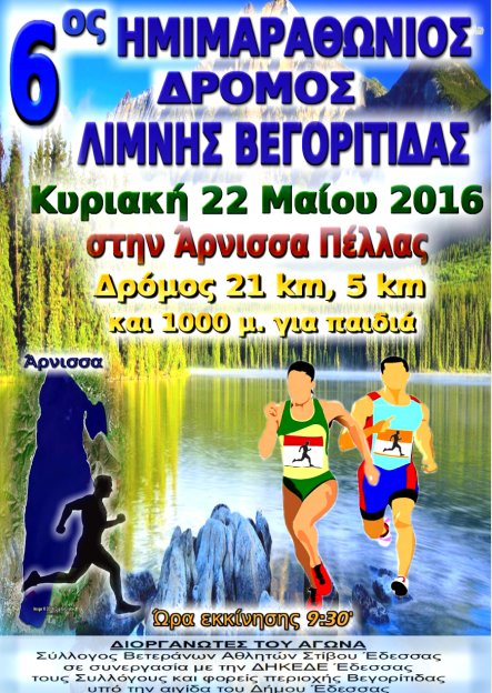 Ο Σύλλογος Βετεράνων Αθλητών Στίβου Έδεσσας σε συνεργασία με Συλλόγους και φορείς της περιοχής Βεγορίτιδας υπό την αιγίδα του Δήμου Έδεσσας διοργανώνουν τον 6ο Ημιμαραθώνιο λίμνης Βεγορίτιδας την Κυριακή 22 Μαΐου 2016 στην Άρνισσα Πέλλας.