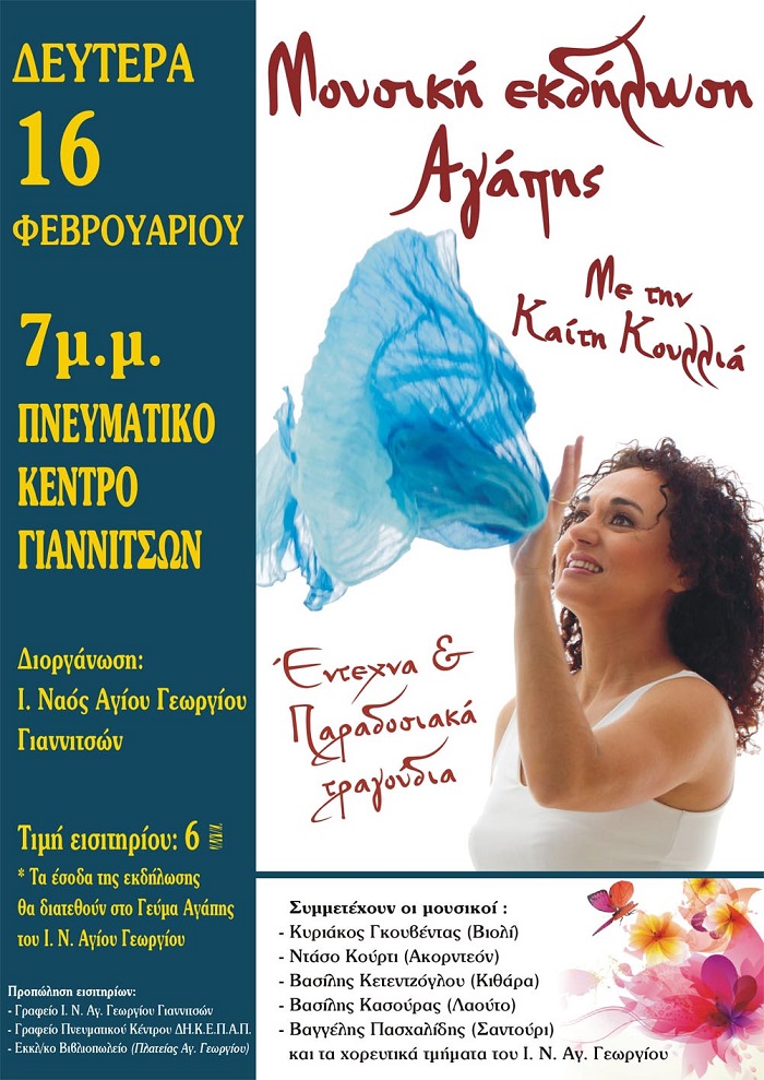 Έκφραση αγάπης και ανθρωπιάς αποτελεί η Μουσική Εκδήλωση που θα πραγματοποιηθεί με την ευλογία της Ιεράς Μητροπόλεως Εδέσσης, Πέλλης και Αλμωπίας από την ενορία Αγίου Γεωργίου Γιαννιτσών την Δευτέρα 16