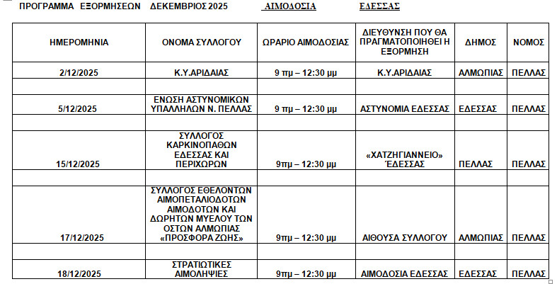 ΑΙΜΟΔΟΣΙΑ ΕΔΕΣΣΑΣ- ΠΡΟΓΡΑΜΜΑ ΕΘΕΛΟΝΤΙΚΗΣ ΑΙΜΟΔΟΣΙΑΣ ΓΙΑ ΤΟΝ ΜΗΝΑ ΔΕΚΕΜΒΡΙΟ 2025