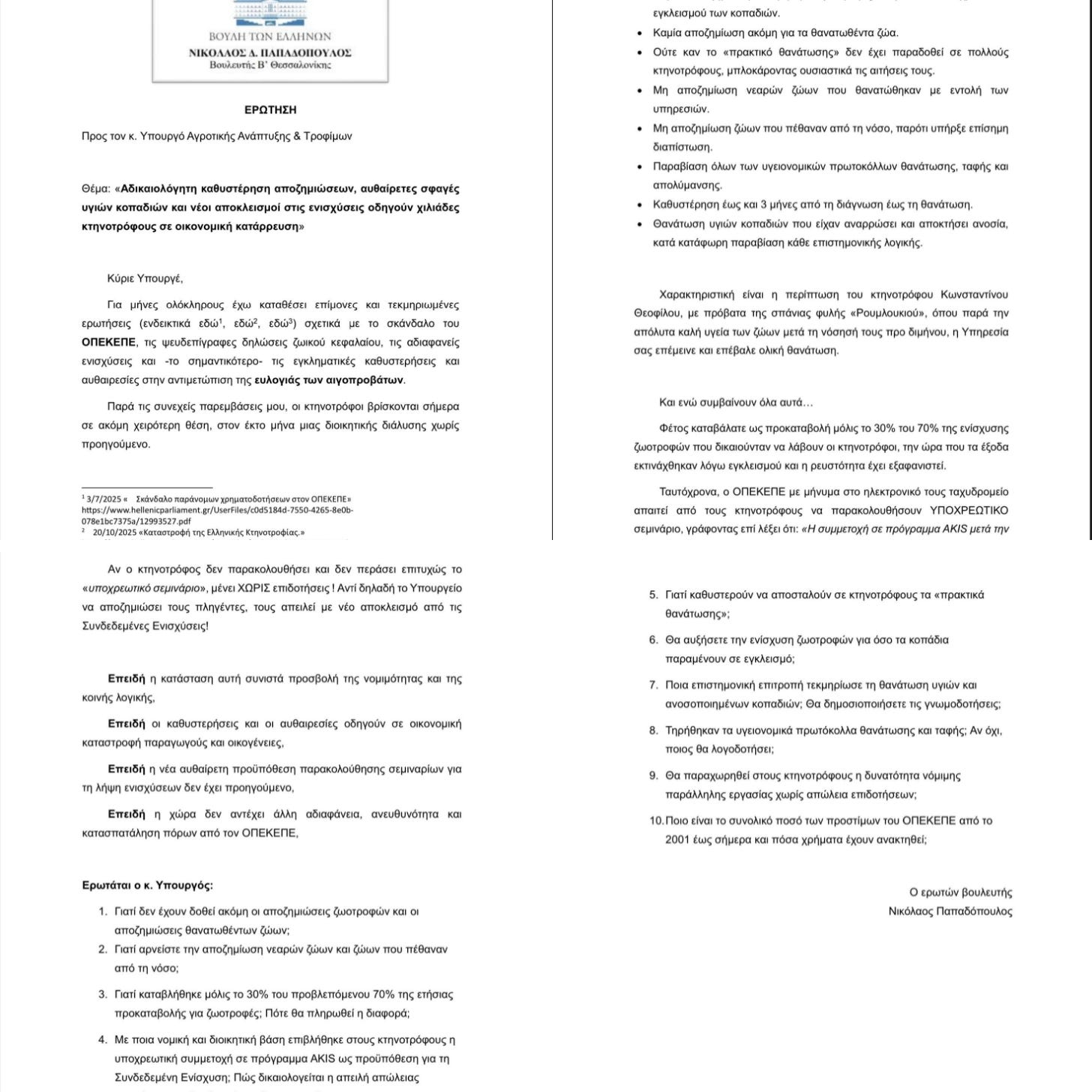 Στις 3 Ιουλίου 2025 ρωτούσα¹ τον Υπουργό Αγροτικής Ανάπτυξης & Τροφίμων για το σκάνδαλο του ΟΠΕΚΕΠΕ: