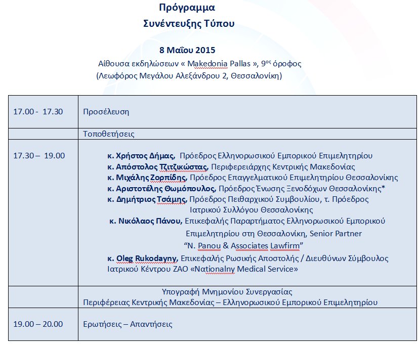 Συνέντευξη Τύπου, με αφορμή την επίσκεψη ρωσικής αποστολής εκπροσώπων ιδιωτικών ρωσικών ιατρικών κέντρων, για την ανάπτυξη του ιατρικού τουρισμού ανάμεσα σε Ρωσία και Ελλάδα, διοργανώνουν από κοινού η Περιφέρεια Κεντρικής Μακεδονίας και το Ελληνορωσικό Εμπορικό Επιμελητήριο.