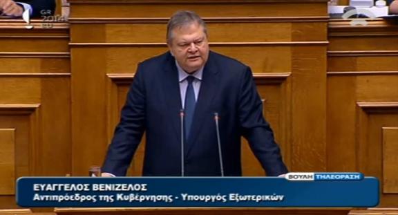 Τη θέση της Ελλάδας στο ζήτημα της ονομασίας της ΠΓΔΜ επανέλαβε ο αντιπρόεδρος της κυβέρνησης και υπουργός Εξωτερικών Ευάγγελος Βενιζέλος, απαντώντας σήμερα στη Βουλή σε επίκαιρη ερώτηση του προέδρου των Ανεξάρτητων Ελλήνων Πάνου Καμμένου.