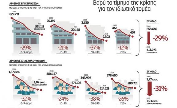 Για να γίνει, όμως, καλύτερα αντιληπτή η έκταση του χτυπήματος που έχει δεχθεί ο ιδιωτικός τομέας της χώρας κατά τη διάρκεια της κρίσης απαιτείται μια ματιά ακόμα πιο πίσω: Από το 2008 έως σήμερα έχουν χαθεί 244.712 επιχειρήσεις. Από 858.685 που καταμετρήθηκαν το 2008, σύμφωνα με επίσημα στοιχεία της Ευρωπαϊκής Επιτροπής, έχουν μειωθεί στις 613.973 στα τέλη του 2015. Μαζί τους χάθηκαν και 842.670 χιλιάδες θέσεις εργασίας από το 2008 έως και το 2015. Σε όρους προστιθέμενης αξίας η εξαφάνιση αυτών των εταιρειών αφαίρεσε και 30,31 δισ. ευρώ προϊόντος.