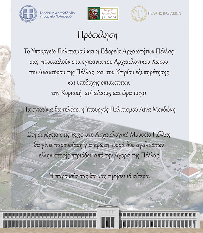 Το Υπουργείο Πολιτισμού και η Εφορεία Αρχαιοτήτων Πέλλας σας προσκαλούν στα εγκαίνια του Αρχαιολογικού Χώρου του Ανακτόρου της Πέλλας και του Κτιρίου εξυπηρέτησης και υποδοχής επισκεπτών, την Κυριακή 21/12/2025 και ώρα 12:30.