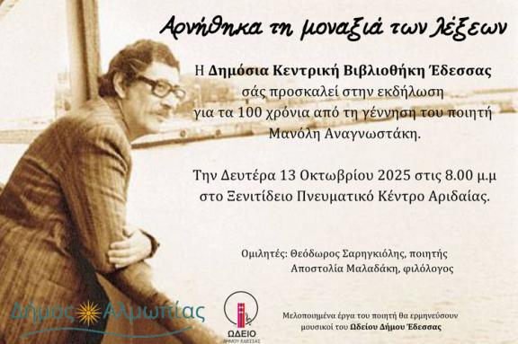 Εκδήλωση-αφιέρωμα στον ποιητή Μανόλη Αναγνωστάκη τη Δευτέρα 13 Οκτωβρίου 2025, στις 20:00, στο Ξενιτίδειο Πνευματικό Κέντρο Αριδαίας.