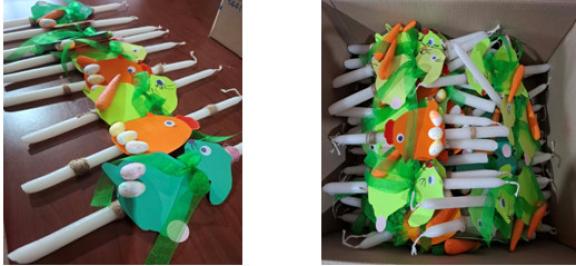 Οι 70 λαμπάδες κατασκευάστηκαν από τους μαθητές του νηπιαγωγείου σε συνεργασία με τους εκπαιδευόμενους του 1ου Εργαστηριακού Κέντρου Αριδαίας με το τμήμα Βρεφονηπιοκόμων(1ο Ε.Κ. Αριδαίας).