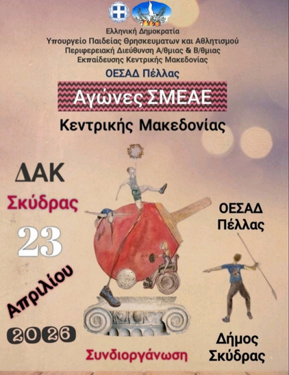Στους παραπάνω αγώνες συμμετέχουν οι Σχολικές Μονάδες Ειδικής Αγωγής και Εκπαίδευσης σ΄επίπεδο Περιφέρειας Κεντρικής Μακεδονίας και θα πραγματοποιηθούν στο Δημοτικό Αθλητικό Κέντρο (Δ.Α.Κ.) Σκύδρας, την Πέμπτη 23 Απριλίου 2026, με ώρα έναρξης 10:00΄.