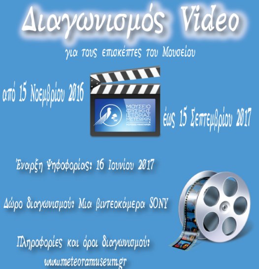 Μετά τη μεγάλη επιτυχία, που σημείωσε ο διαγωνισμός φωτογραφίας, που διοργάνωσε το Μουσείο Φυσικής Ιστορίας Μετεώρων και Μουσείο Μανιταριών και διήρκεσε ένα χρόνο, τώρα διοργανώνει διαγωνισμό ανάδειξης του καλύτερου video που έχει τραβηχτεί στο Μουσείο. Ο διαγωνισμός αφορά τους επισκέπτες του Μουσείου και θα ξεκινήσει στις 15 Νοεμβρίου 2016 και θα ολοκληρωθεί 15 Σεπτεμβρίου 2017.