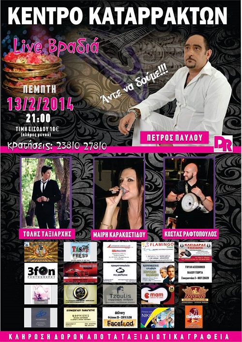 Σας περιμένουμε όλους στο Κέντρο Καταρρακτών την Πέμπτη 13 Φεβρουαρίου στις 21:00, να υποδεχτούμε μαζί τον Άγιο Βαλεντίνο παρέα με τον Πέτρο Παύλου και το επιτελείο του. Μαζί του η Μαίρη Καρακωστίδου, ο Τόλης Ταξιάρχης και
