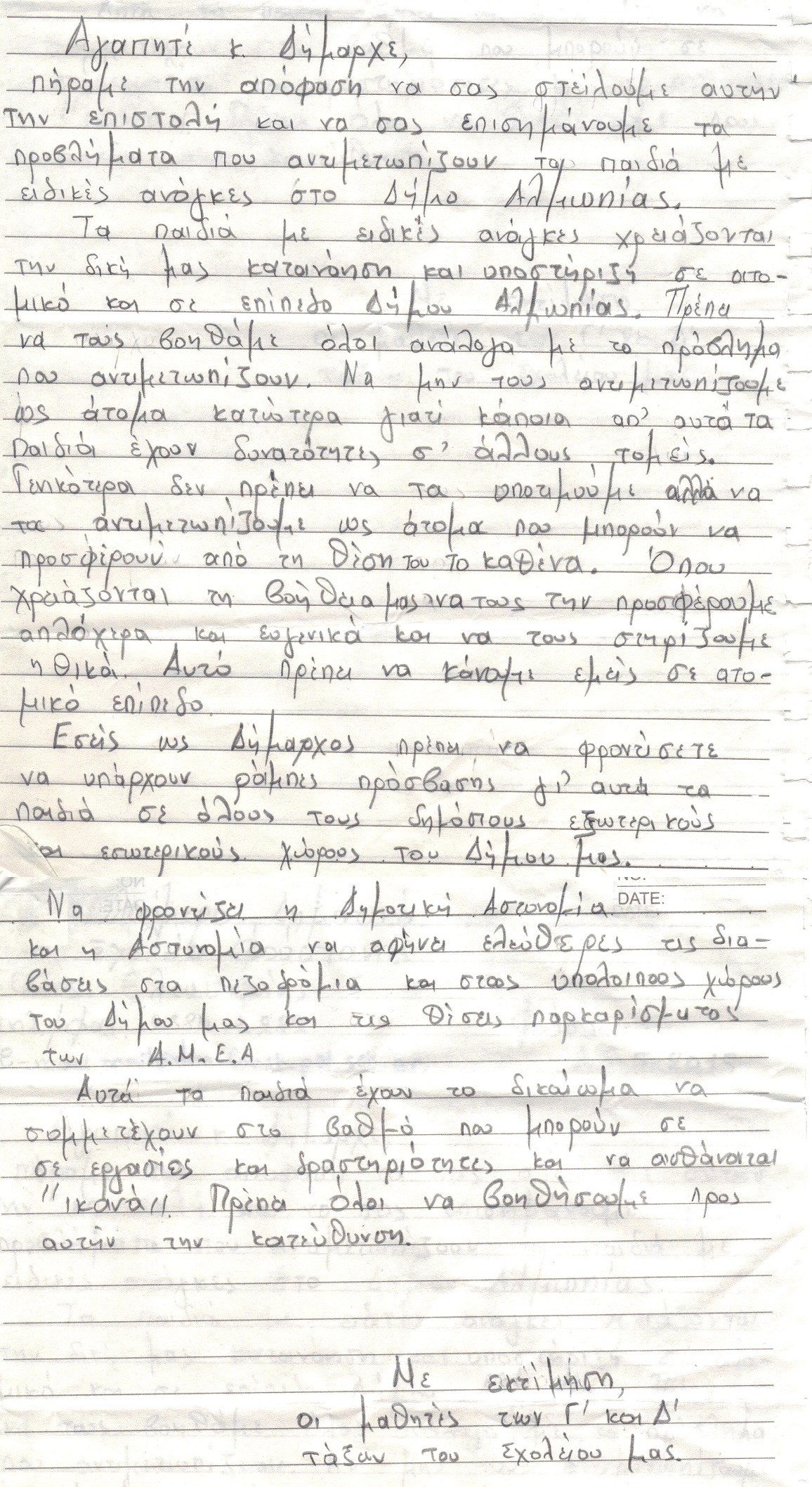 την οποία υπογράφουν οι μαθητές των Γ’ και Δ’ τάξεων του Δημοτικού Σχολείου Φούστανης, που γράφτηκε με αφορμή το μάθημα «Η 5η Βασική Αρχή των Δικαιωμάτων του Παιδιού» και στην οποία επισημαίνονται τα προβλήματα που αντιμετωπίζουν τα παιδιά με ειδικές ανάγκες στον Δήμο Αλμωπίας.