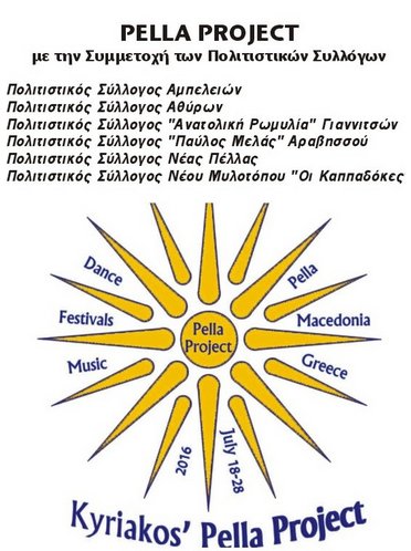 Ξεκινούν την Δευτέρα 18 Ιουλίου και ολοκληρώνονται την Πέμπτη 28 Ιουλίου οι εκδηλώσεις «PELLA PROJECT», που θα πραγματοποιηθούν σε Δημοτικές και Τοπικές Κοινότητες της ευρύτερης περιοχής μας και θα παρακολουθήσουν επισκέπτες από διάφορες χώρες του κόσμου.