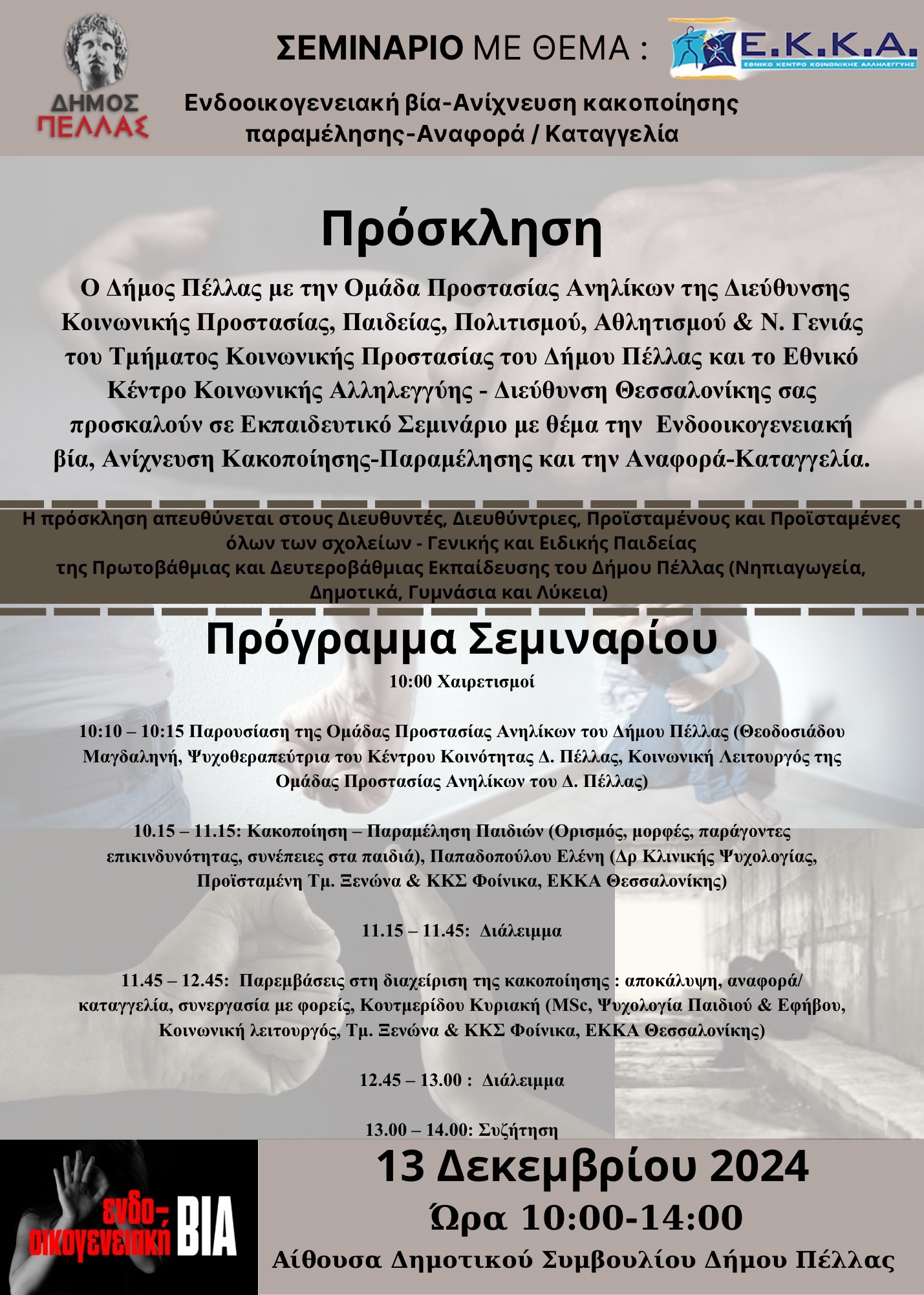 Ο Δήμος Πέλλας με την Ομάδα Προστασίας Ανηλίκων της Διεύθυνσης Κοινωνικής Προστασίας, Παιδείας, Πολιτισμού, Αθλητισμού & Ν. Γενιάς του Τμήματος Κοινωνικής Προστασίας του Δήμου και το Εθνικό Κέντρο Κοινωνικής Αλληλεγγύης (Ε.Κ.Κ.Α)- Διεύθυνση Θεσσαλονίκης, διοργανώνουν Εκπαιδευτικό Σεμινάριο με θέμα την Ενδοοικογενειακή Βία, την Ανίχνευση Κακοποίησης- Παραμέλησης και την Αναφορά - Καταγγελία.