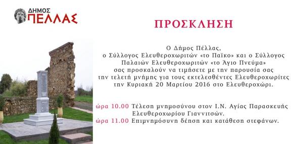 ΔΗΜΟΣ ΠΕΛΛΑΣ : ΠΡΟΣΚΛΗΣΗ-ΤΕΛΕΤΗ ΜΝΗΜΗΣ ΓΙΑ ΤΟΥΣ ΕΚΤΕΛΕΣΘΕΝΤΕΣ ΕΛΕΥΘΕΡΟΧΩΡΙΤΕΣ Τετάρτη, 16 Μαρτίου, 2016 - 13:07 ΔΗΜΟΣ ΠΕΛΛΑΣ : ΠΡΟΣΚΛΗΣΗ-ΤΕΛΕΤΗ ΜΝΗΜΗΣ ΓΙΑ ΤΟΥΣ ΕΚΤΕΛΕΣΘΕΝΤΕΣ ΕΛΕΥΘΕΡΟΧΩΡΙΤΕΣ , , Κατηγορία: Εκδηλώσεις