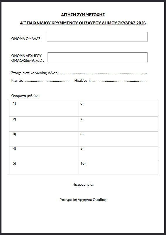 ΔΗΜΟΣ ΣΚΥΔΡΑΣ-ΑΙΤΗΣΕΙΣ ΣΥΜΜΕΤΟΧΗΣ ΣΤΟ ΠΑΙΧΝΙΔΙ ΤΟΥ ΧΑΜΕΝΟΥ ΘΗΣΑΥΡΟΥ