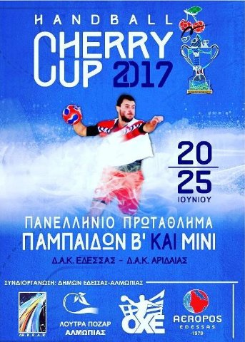 Σας προσκαλούμε στο Πανελλήνιο Πρωτάθλημα Handball Cherry Cup 2017, το οποίο συνδιοργανώνεται από τον Δήμο Αλμωπίας και τον Δήμο Έδεσσας, στο Δ.Α.Κ. Αριδαίας και στο Δ.Α.Κ. Έδεσσας 20-25 Ιουνίου 2017. Η τελετή έναρξης θα πραγματοποιηθεί στην Έδεσσα στις 20 Ιουνίου και η τελετή λήξης στην Αριδαία στις 25 Ιουνίου. Θα διεξαχθούν 132 αγώνες, εκ των οποίων οι 65 στην Αριδαία και θα συμμετέχουν 300 αθλητές.