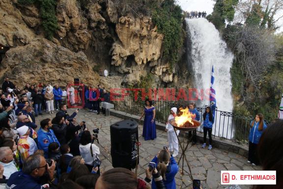 Η κορύφωση των εκδηλώσεων σημειώθηκε στους Καταρράκτες, όπου ο κόσμος είχε κατακλύσει το πάρκο και τον χώρο γύρω από το φυσικό τοπόσημο, δημιουργώντας μια εντυπωσιακή ατμόσφαιρα υποδοχής. Παρόντες ήταν και επίσημες αντιπροσωπείες της Ε.Ο.Ε. και της Οργανωτικής Επιτροπής των Χειμερινών Ολυμπιακών Αγώνων «Milano Cortina 2026». Ακολούθησαν η αφή του βωμού, η ανάκρουση των ύμνων, η έπαρση των σημαιών, οι καθιερωμένοι χαιρετισμοί και η ανταλλαγή δώρων, ενώ το πολιτιστικό πρόγραμμα ολοκλήρωσε την τελετουργία.