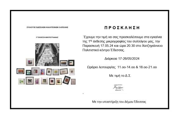 40 καλλιτέχνες του Συλλόγου Apellis Σύλλογος Εδεσσαίων Καλλιτεχνών, εκθέτουν πάνω από 160 έργα, στην 1η Έκθεση Μικρογραφίας με Ζωγραφική, Κολάζ, αγιογραφία, φωτογραφία, μικτές τεχνικές, ψηφιακά έργα μέσω AΙ, κλπ, στο Χατζηγιάννειο πολιτιστικό στην Εδεσσα από 17- έως 26 Μαίου 2024.