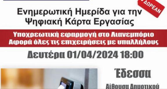 ΗΜΕΡΙΔΑ για ζητήματα εφαρμογής της Ψηφιακής Κάρτας Εργασίας, διοργανώνει ο Εμπορικός Σύλλογος Έδεσσας. Η ημερίδα πραγματοποιείται στο πλαίσιο της ενημέρωσης των μελών του, αλλά και όλων των επιχειρήσεων του Νομού μας και θα διεξαχθεί την Δευτέρα 1 Απριλίου και ώρα 18.00 στην αίθουσα του πολιτιστικού κέντρου του Δήμου Έδεσσας. Κεντρικός εισηγητής θα είναι ο κ. Ευάγγελος Χατζηπέτκος, μέλος της Επιστημονικής Ομάδας Epsilon Net.