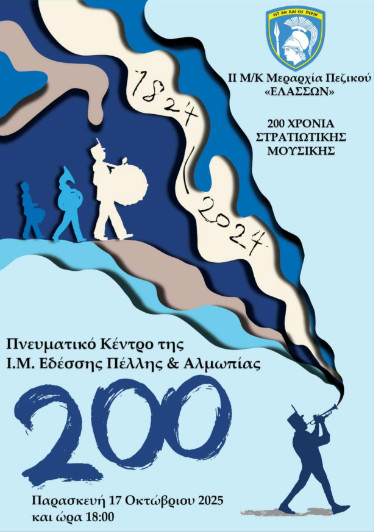 Μέσα σε κλίμα συγκίνησης και υπερηφάνειας, πραγματοποιήθηκε στην Έδεσσα η επετειακή μουσική εκδήλωση αφιερωμένη στα «200 Χρόνια από την Ίδρυση της 1ης Στρατιωτικής Μουσικής στην Ελλάδα». Η εκδήλωση τίμησε την ιστορική διαδρομή και την ανεκτίμητη προσφορά της Στρατιωτικής Μουσικής στους εθνικούς αγώνες και τον ελληνικό πολιτισμό.