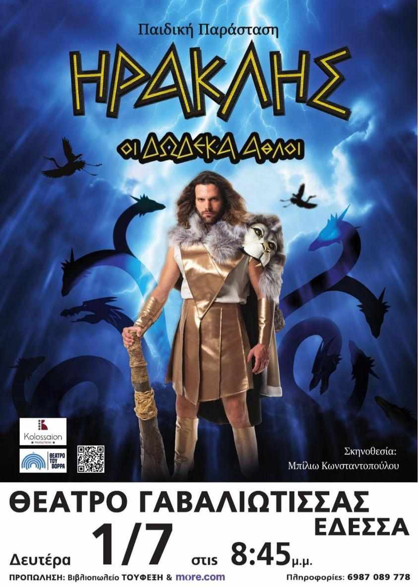Η θεατρική παράσταση «Ηρακλής Οι Δώδεκα Άθλοι», θα βρίσκεται για μία μοναδική παράσταση στην Έδεσσα τη Δευτέρα1 Ιουλίου2024 στις 8:45μ.μ.στο Ανοιχτό Θέατρο Γαβαλιώτισσας.