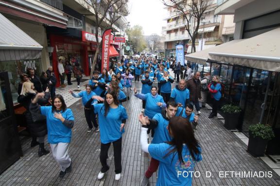 Ενα γαλάζιο ποτάμι όλοι όσοι συμμετείχαν φορώντας γαλάζια ομοιόμορφα μπλουζάκια μαθητές νηπιαγωγοί δάσκαλοι καθηγητές και γονείς. Ένα μουσικό ποτάμι αυτό της μοναδικότητας όπου όλα τα παιδιά το ένα δίπλα στο άλλο χαρούμενα ενώθηκαν χέρι με χέρι τραγούδησαν και χόρεψαν για να δώσουν το δικό τους μήνυμα στην προστασία και την κοινωνικοποίηση των παιδιών με αναπηρία.