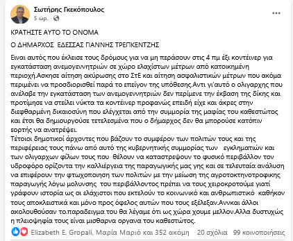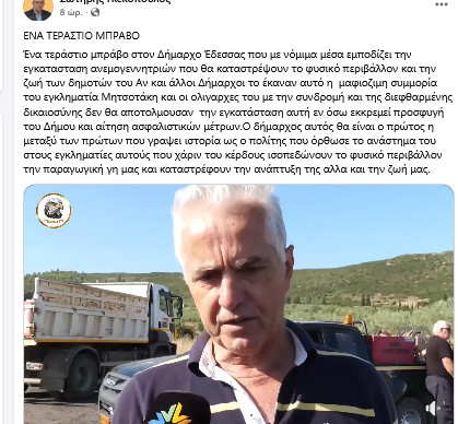 "Διαψεύδεται κατηγορηματικά το ποστ που ανήρτησε συνταξιούχος δικηγόρος με φήμες περί τοποθέτησης ανεμογεννητριών κοντά σε κατοικημένη περιοχή στην Έδεσσα . Ο Δήμαρχος Γιάννης Τσεπκεντζής δηλώνει άγνοια για αυτό το δημοσίευμα ξεκαθαρίζοντας ότι η είδηση είναι εντελώς ψευδής. Δεν ήταν και λίγοι αυτοί που κοινοποίησαν το δημοσίευμα από το προφίλ στο facebook αυτού που μπερδεύτηκε και το δημοσίευσε παραπλανώντας αρκετούς χωρίς κάν να το διασταρώσουν αν είναι αλήθεια.
