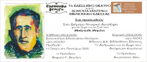 - την Κυριακή 29 Μαρτίου 2015 και ώρα 19:00 στην αίθουσα της Δημόσιας Κεντρικής Βιβλιοθήκης Έδεσσας θα γίνει παρουσίαση της ζωής και του έργου του Μπέρτολτ Μπρέχτ και