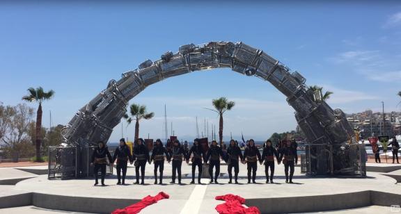 Το «Πυρρίχιο Πέταγμα» αποκάλυψαν ο δήμαρχος Πειραιά Γιάννης Μώραλης, ο πρόεδρος της ΠΑΕ Ολυμπιακός και πρώτος Δημοτικός Σύμβουλος Πειραιά Βαγγέλης Μαρινάκης, ενώ ο Ηλίας Υφαντίδης ερμήνευε το «Αητέν' ς επαραπέτανεν».