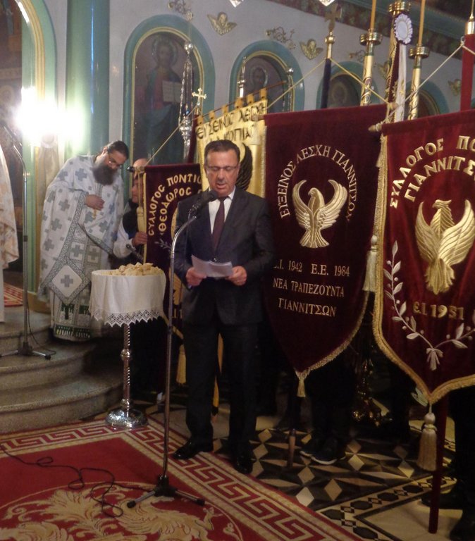 Εντός του Ιερού Ναού πραγματοποιήθηκε κεντρική ομιλία από τον Αντιπεριφερειάρχη Πέλλας κ. Θεόδωρο Θεοδωρίδη ο οποίος τόνισε τη σημασία της απότισης ελάχιστου φόρου τιμής στους ήρωες και θύματα της Γενοκτονίας των Ελλήνων του Πόντου. Ο κ. Αντιπεριφερειάρχης έκανε ειδική αναφορά στα σημαντικά ιστορικά γεγονότα των διώξεων, των βασανισμών, των εξευτελισμών και των σφαγιασμών, με πλήρη τεκμηρίωση για το προσχεδιασμένο και αποτρόπαιο έγκλημα της Γενοκτονίας των Ελλήνων του Πόντου. Επίσης, κλείνοντας την ομιλία του, τόνισε ότι οι εκδηλώσεις μνήμης που πραγματοποιούνται κάθε χρόνο αποτελούν «εκδηλώσεις εθνικού συναγερμού για τους πολίτες και την κοινωνία, προκειμένου να μην ζήσουμε μία ακόμη Γενοκτονία σε σύγχρονη μορφή», συνέπεια της οικονομικής κρίσης, των πρόσφατων γεωπολιτικών εξελίξεων κι άλλων δραματικών γεγονότων που βιώνει η Ελλάδα την τελευταία περίοδο.