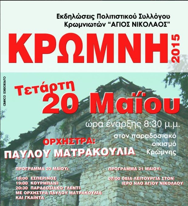 O Πολιτιστικός.Σύλλογος Κρωμνιωτών Άγιος Νικόλαος σας προσκαλεί την Τετάρτη 20 Μαίου 2015 στο παραδοσιακό οικισμό Κρώμνης στις εορτατικές του εκδηλώσεις ''Κρωμνιώτικα 2015''
