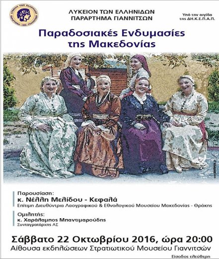 Το Λύκειο των Ελληνίδων Γιαννιτσών πραγματοποιεί εκδήλωση το Σάββατο 22 Οκτωβρίου 2016, στις 8.00 μ.μ., στην αίθουσα εκδηλώσεων του Στρατιωτικού Μουσείου Γιαννιτσών, με θέμα τις «Παραδοσιακές Ενδυμασίες της Μακεδονίας».