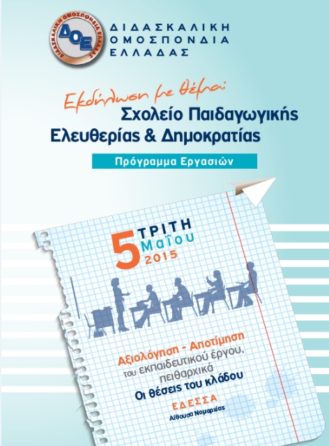 Ο Σύλλογος Εκπ/κών Α/θμιας Εκπ/σης Έδεσσας έχει την τιμή να φιλοξενήσει την ημερίδα που διοργανώνει το Δ.Σ. της Δ.Ο.Ε.(Διδασκαλικής Ομοσπονδίας Ελλάδας) στην Έδεσσα στις 5 Μαϊου 2015, στην αίθουσα της Νομαρχίας,