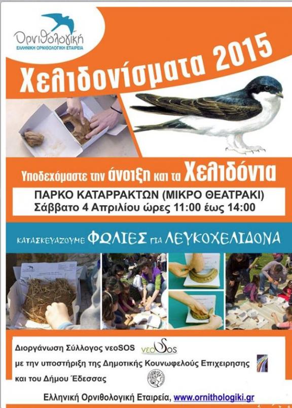 Το Σάββατο 4 Απριλίου 2015, από τις 11:00 το πρωί έως 14:00 το μεσημέρι, στο Πάρκο των Καταρρακτών, θα λειτουργεί εργαστήρι κατασκευής χελιδονοφωλιών