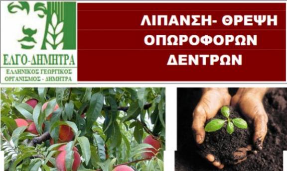 Το κέντρο εκπαίδευσης και κατάρτισης του ΕΛ.Γ.Ο. «ΔΗΜΗΤΡΑ» Σκύδρας σε συνεργασία με την Περιφερειακή Ενότητα Πέλλας και τον Δήμο Σκύδρας στο πλαίσιο των αρμοδιοτήτων του όσο αφορά την κατάρτιση και ενημέρωση του αγροτικού πληθυσμού θα πραγματοποιήσει εκπαιδευτική-ενημερωτική εκδήλωση με θέμα: «Θρέψη-Λίπανση των οπωροφόρων δένδρων».