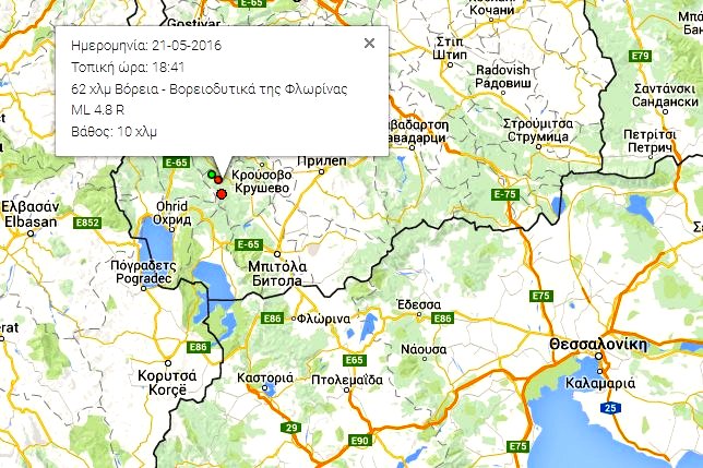 Σεισμική δόνηση 4,8 βαθμών της κλίμακας Ρ'ιχτερ σημειώθηκε 68 χιλιόμετρα βόρεια της Φλώρινας στις 19.40 το απόγευμα, έξω από την πόλη Κρούσεβο της ΠΓΔΜ .