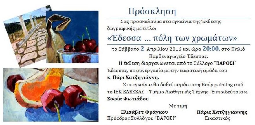 Ο Πολιτιστικός Σύλλογος «ΒΑΡΟΣΙ» Έδεσσας, σε συνεργασία με την Εικαστική Oμάδα του κ. Πάρι Χατζηγιάννη, διοργανώνει Έκθεση ζωγραφικής, με τίτλο: