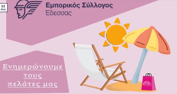 Ο Εμπορικός Σύλλογος Έδεσσας διενήργησε έρευνα στα μέλη του, με ίδια μέσα, με σκοπό την τάση των τοπικών επιχειρήσεων της πόλης μας για το εάν θα παραμείνουν ανοιχτά τα καταστήματα στις 14 Αυγούστου, ημέρα Δευτέρα, ανήμερα της 15 Αυγούστου που ανήκει στις υποχρεωτικές αργίες ώστε να εκμεταλλευτούν ένα τριήμερο προς όφελός τους .Η δημοσιοποίηση της έρευνας βοηθάει τόσο στην εύρυθμη λειτουργία της αγοράς όσο και στην ενημέρωση του καταναλωτικού κοινού προς διευκόλυνσης του .