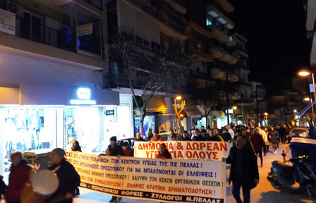 Με τη μεγάλη συμμετοχή του λαού της περιοχής, πραγματοποιήθηκε στην Πλατεία ΕΠΟΝ στον Πεζόδρομο στα Γιαννιτσά το Συλλαλητήριο για την υπεράσπιση των δημόσιων νοσοκομείων και των κέντρων υγείας του νομού, που συνδιοργάνωσαν οι φορείς που συντονίζονται και στηρίζουν το Κάλεσμα της σύσκεψης σωματείων, ενώσεων, συλλόγων που πραγματοποιήθηκε στις 18 Ιανουαρίου στο Εργατικό Κέντρο Γιαννιτσών.