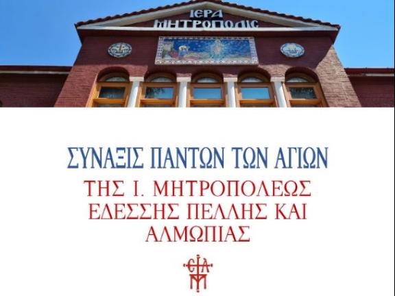 Την Κυριακή 5 Οκτωβρίου θα πραγματοποιηθεί η Σύναξις, δηλαδή ο κοινός εορτασμός, όλων των Αγίων της Ιεράς Μητροπόλεως Εδέσσης, Πέλλης και Αλμωπίας στον ιερό ναό Αγίων Πάντων Εδέσσης.