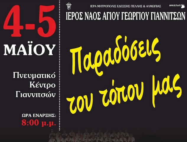 Θεατρικά δρώμενα και μουσικοχορευτικές εκδηλώσεις με θέμα «Παραδόσεις του τόπου μας», διοργανώνει την Τετάρτη 4 και την Πέμπτη 5 Μαΐου, ο Ιερός Ναός Αγίου Γεωργίου Γιαννιτσών, σε συνεργασία με την ΔΗ.Κ.Ε.Π.Α.Π.