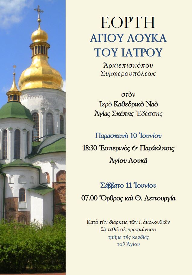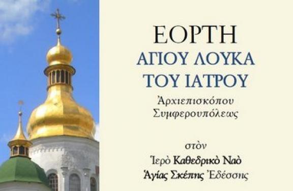Με την ευκαιρία της μνήμης του Αγίου Λουκά του Ιατρού, Αρχιεπισκόπου Συμφερουπόλεως στον Ιερό Καθεδρικό Ναό Αγίας Σκέπης Εδέσσης οι ιερές ακολουθίες θα τελεσθούν σύμφωνα με το παρακάτω πρόγραμμα: