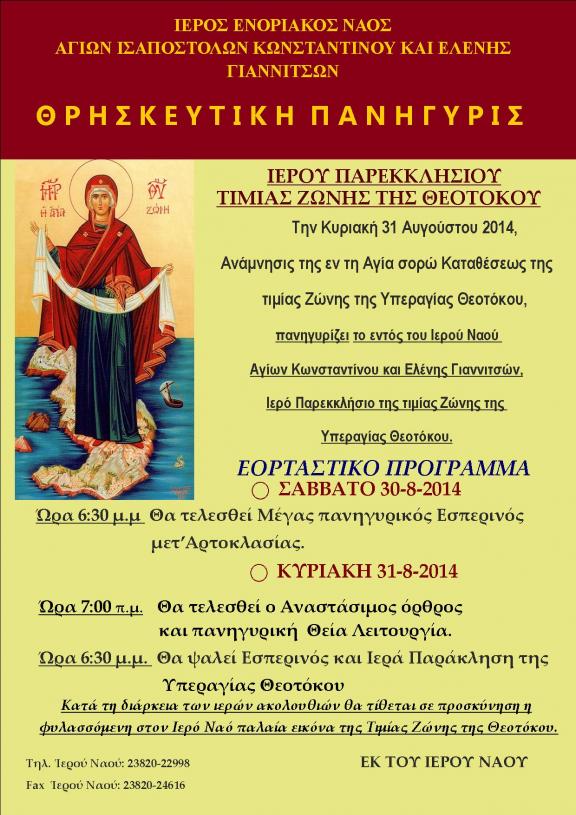 Την Κυριακή 31 Αυγούστου 2014, εορτή αναμνήσεως της εν τη Αγία σορώ Καταθέσεως της Τιμίας Ζώνης της Υπεραγίας Θεοτόκου, πανηγυρίζει το εντός του Ιερού Ναού Αγίων Κωνσταντίνου και Ελένης Γιαννιτσών Ιερό Παρεκκλήσιο της Τιμίας Ζώνης της Θεοτόκου.