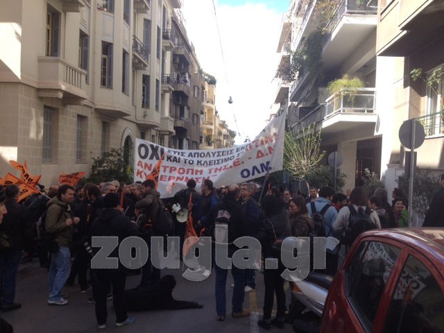 Ήδη από τις 13.00 μέλη της ΟΛΜΕ και της ΠΟΕ-ΟΤΑ άρχισαν να συγκεντρώνονται στην πλατεία Κλαυθμώνος, όπου στις 13.30 ήταν προγραμματισμένο συλλαλητήριο. Παράλληλα, τα μέλη τους αψήφησαν την απαγόρευση και ξεκίνησαν στις 13.40 πορεία προς το Υπουργείο Διοικητικής Μεταρρύθμισης και τη Βουλή. Τελικά, είκοσι λεπτά αργότερα, οι διαδηλωτές, βλέποντας πως ο δρόμος προς τη Βουλή είναι αποκλεισμένος, επέλεξαν να γυρίσουν προς τα πίσω με κατεύθυνση προς την Ομόνοια. Ωστόσο, σταμάτησαν στη συμβολή των οδών Σκουφά και Σίνα, και διαπραγματεύτηκαν με τους αστυνομικούς, προκειμένου να φθάσουν στη Βουλή και στο Υπουργείο Διοικητικής Μεταρρύθμισης ακολουθώντας διαφορετική διαδρομή.